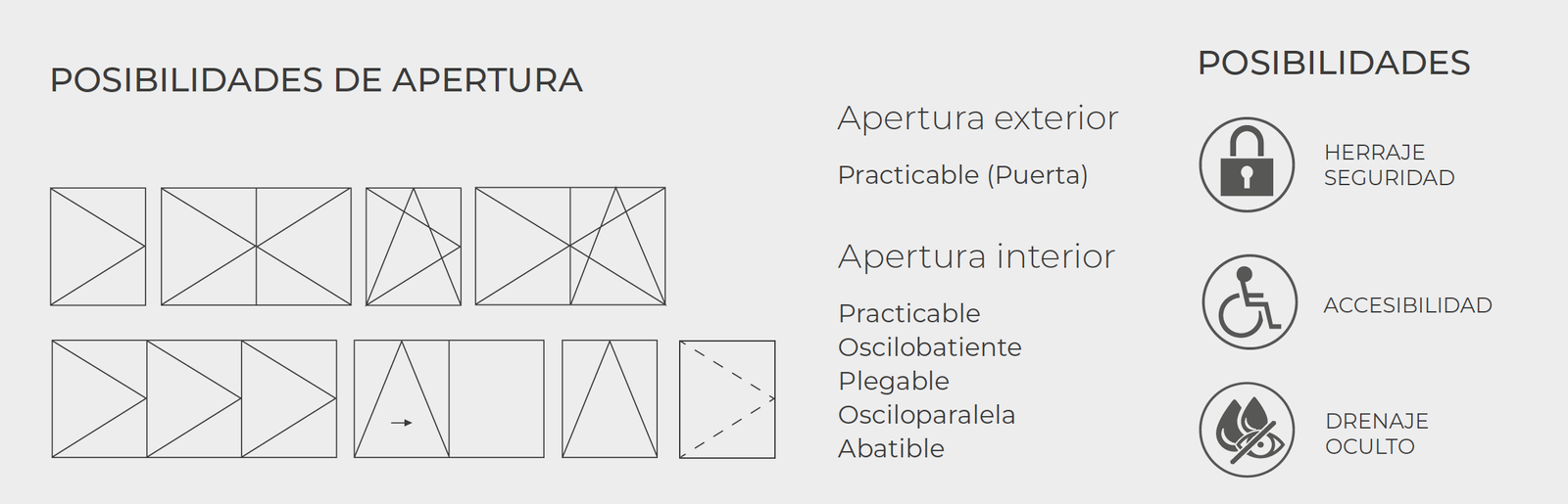 Sistema abisagrado de 70 mm de profundidad de marco con una capacidad máxima de acristalamiento de 42 mm. Su perfilería de 5 cámaras interiores en marco y hoja le confiere una gran eficiencia energética con un valor de transmitancia Uw desde 0,9 W/m2K. Posibilidad de hojas con estética recta, achaflanada o curva.